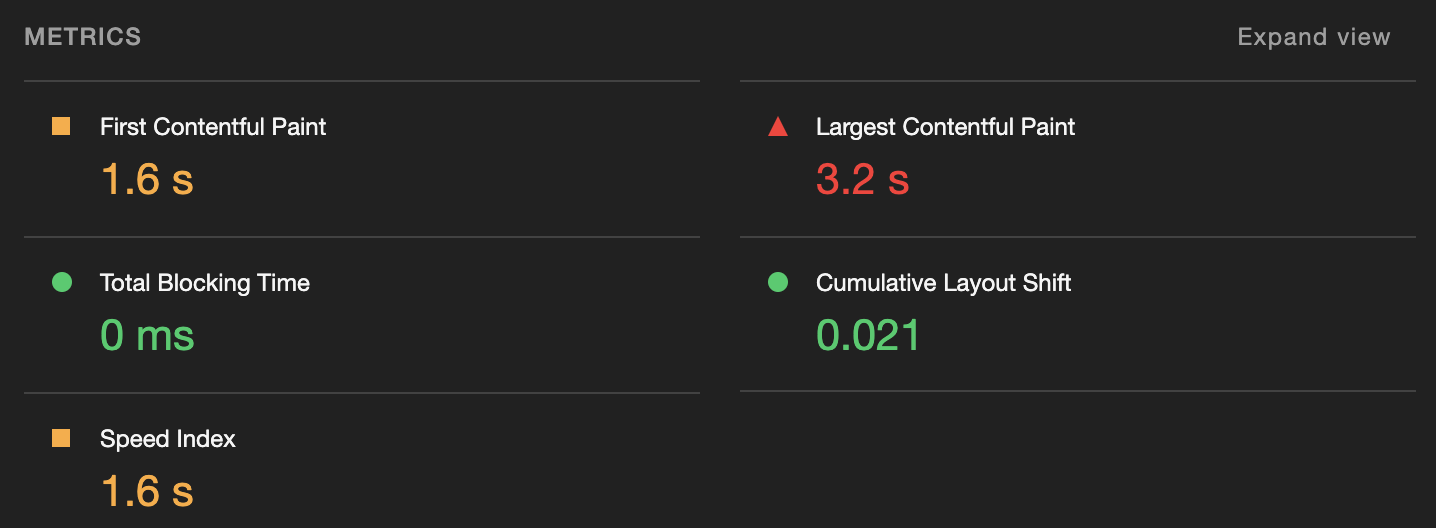 초기 DOM 콘텐츠를 렌더링하는데 걸리는 시간을 측정. 첫번째 텍스트 또는 이미지가 표시되는 시간을 의미. FCP 측정 시점을 시작점으로 하는 다른 Metric들이 있기 때문에, 가장 먼저 찍히는 FCP는 다른 항목들의 점수 및 전체 점수에 큰 영향을 줄 수 있다!