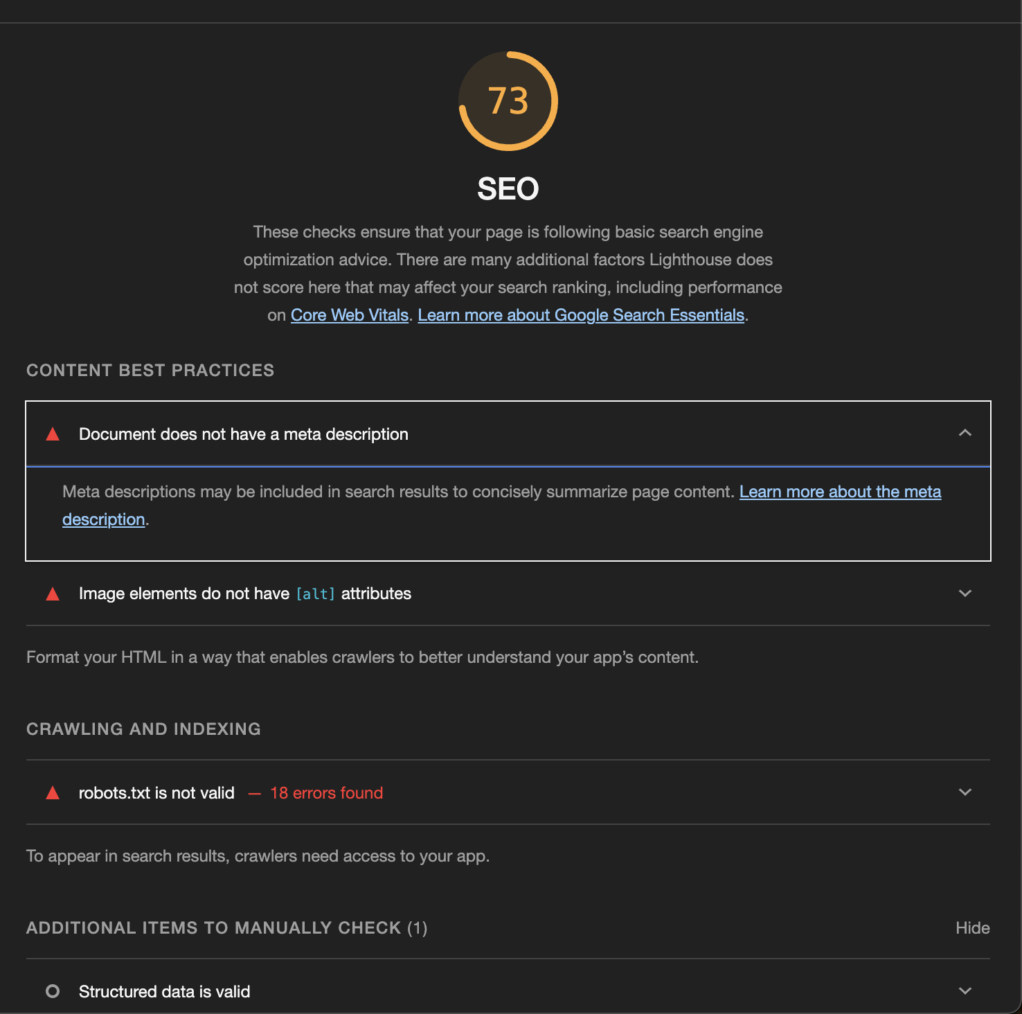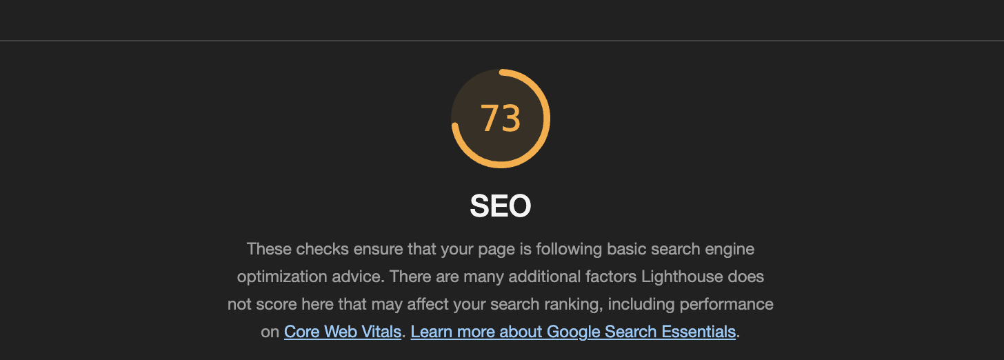 SEO는 검색 엔진에 대해 최적화된 순위 결과를 가지고 있는지 평가하는 지표이다. meta 요소가 잘 작성되어 있는지, robots.txt 파일이 유효한지, 컨텐츠를 읽는데 글꼴 크기가 무리가 없는지 등등을 고려한다.
